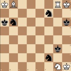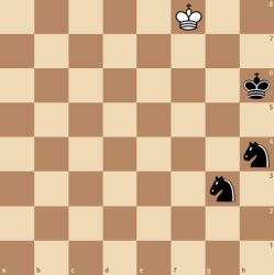 Mater avec deux cavaliers est aussi possible, grâce au concours de Gabriel. Par exemple, dans cette position avec le trait aux Noirs, 1... Cgf5 2. Rg8? Ce7+ 3. Rh8?? Chg6 ≠