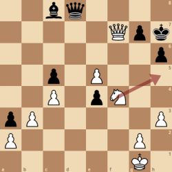 Les Noirs en profitent avec 35...Dd4+ Non seulement, la fourchette gagne le pion e5, mais, en plus, avec gain de temps puisqu'après 35.Rh1 (pour éviter 35.Rh2 Dxe5+), le pion est quand même capturé avec gain de temps grâce à l'échec intermédiaire Da1+ suivi de Dxe5+.