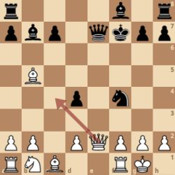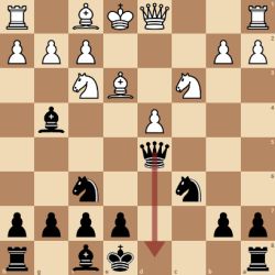 Les Blancs ont réussi garder l'avantage matériel dans une suite classique de la variante Ulvestad (5... b5) de la défense des deux cavaliers. Mais cette variante risquée est pleine de pièges pour les Blancs. Notamment la bourde 13... Dc4+ ?? qui pare l'attaque du cavalier et crée une fourchette récupérant encore un pion en d4.